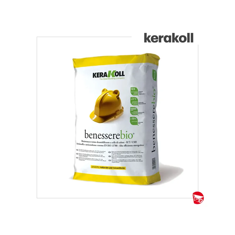 Kerakoll Benesserebio, biointonaco termo-deumidificante a celle di calore, certificato R e T /CSII. Antimuffa e anticondensa a norma EN ISO 13788. Ad alta efficienza energetica. Di pura calce naturale NHL 3.5, Geolegante® minerale, pozzolana amorfa naturale e principi attivi naturali. Altamente traspirante. Prodotto naturale per bioedilizia. Contiene solo materie prime di origine rigorosamente naturale e minerali riciclati. A ventilazione naturale attiva nella diluizione degli inquinanti indoor, batteriostatico e fungistatico naturale. Riciclabile come inerte a fine vita.