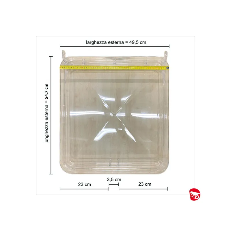 Le misure sono indicate nelle fotografie di prodotto (misura esterna 49,5 x 54,7 cm, perni/cerniere posteriori posizionati sui lati esterni).